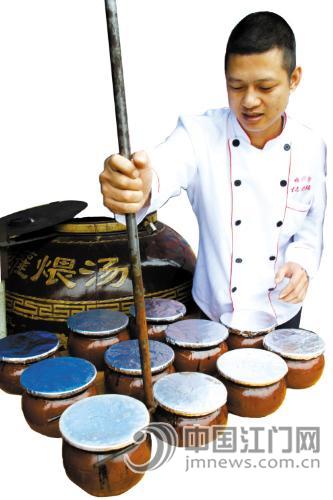 豹哥人很随和,见我好学,当然“诲而不倦”。豹哥说:“这是从江西订制的瓦缸,专做煨汤,里头能放30多个小瓦罐,加木炭、放瓦罐都是用一个铁制的‘叉’从顶部伸进去进行。此外小罐上面还有一个小盖,盖上有一小孔,用于煨汤时排出多余的热气。这种汤源自江西民间,我出差时偶然遇见,发现其汤甚为浓香清甜,比一般的老火汤更为香甜,我便引进并进行改良。”