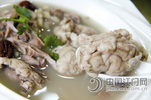 广东人喜欢饭前先喝汤,因此“全羊宴”打头阵的是浓郁鲜美的羊胎盘炖羊脑汤。只见汤色乳黄色,热气腾腾,一入口,没有腥膻味,浓郁之余有几丝清甜,爽口而不腻滞,令人赞绝。在座者频叫添汤,有甚者连喝三碗仍觉意犹未尽。