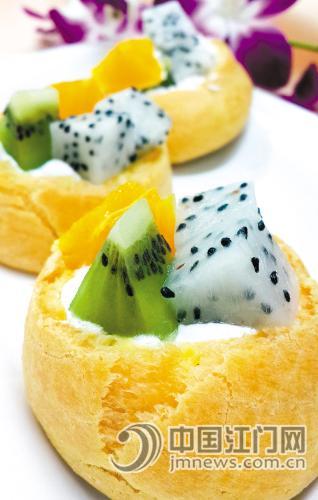 日式水果泡芙 “金凯悦”中餐楼大厨洪哥得知现在少男少女都追“日韩风”,便在口味上来了点“新招”。日式水果泡芙是他的成功作品,不难发现这份泡芙可谓是“抵食夹大件”。平日在甜品屋吃泡芙,几乎是一口一个,入口方便,但食后总觉得不够过瘾。洪哥是客家人,所谓“物似主人形”,泡芙用料足,单是那里头的水果都花了不少心思。