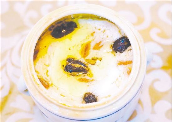 在蓬江区跃进路上,有一家专注炖汤的店,叫御品椰私房汤。这里出品的竹丝鸡炖椰脑汤,深受各路吃货的喜爱。据该店负责人李梓菁介绍,这道竹丝鸡炖椰脑汤采用家庭式的烹饪方式,不添加任何调料,将新鲜的老椰肉用榨汁机榨成椰肉浆,并加入红枣、枸杞、竹丝鸡以及老椰汁等材料炖2—3小时。一盅美味可口的炖汤就出炉啦!打开盅盖,一股清香扑面而来,汤水上面凝固了厚厚一层像豆腐花一样的东西,这应该是椰肉的精华吧!吃起来很嫩滑。拿勺子搅一搅,就能看到丰富的材料,用椰汁炖成的汤也十分清甜。“这道汤连小朋友都非常喜欢喝。”李梓菁说。