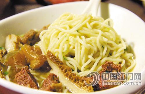 除了本土外海面,近几年来,台湾面在江门也是盛行一时。笔者走进北郊一家微博网友极力推荐的面馆——张生记,这是江门首家正宗台湾牛肉面馆,以肉烂汤鲜、面质精细而著名。