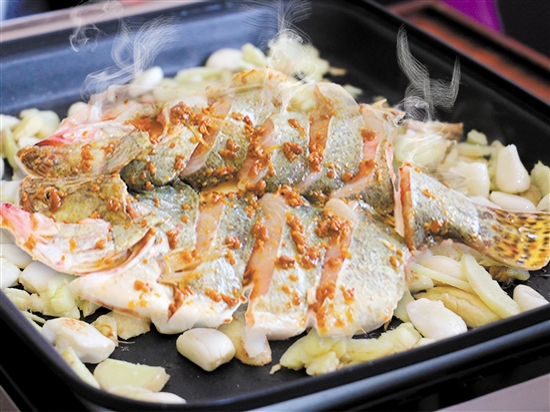 沙湾姜明炉焗桂花鱼:这道菜是中嘉国际大酒店的独创菜式之一,也是梁国兵参加“高级烹饪技师”比赛时的参赛菜品。这道菜用铁盘盛装,一条肥美桂花鱼下面铺满了沙湾姜和蒜头,上桌的鱼还冒着热气,香味瞬间袭来。据梁国兵介绍,酒店特选了农家的沙湾姜,沙湾姜能去除鱼的腥味。鱼肉上有一层红红的酱料,据了解,这秘制的酱料是梁国兵特地找一位制酱老师傅拿的配方。沙湾姜、蒜头、秘制的酱料和桂花鱼一起焗过之后,鱼肉吸收了沙湾姜和酱料的味道,变得别有一番风味,口感清香,鱼肉嫩滑,值得一试!