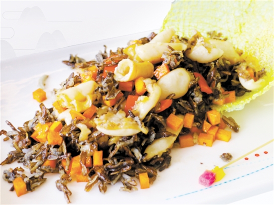 薯香野米爆鲜鲍片:除了吃得好外,还要吃得健康。这道菜是中嘉国际大酒店独创的一道养生菜。菜品选用了台湾黑野米,虽然黑野米颜值不高,但绝对是“绿色美食”。黑野米的膳食纤维是大米的几倍,再配上肉质嫩滑鲜美的鲍鱼片,粗细荤素搭配恰到好处。说到这鲍鱼片,厨师们下了不少功夫。鲍鱼韧度较高,因此,将其切成薄片也非常考验厨师的刀工。笔者看到,这道菜中每片鲍鱼厚度几乎一致,切片的鲍鱼方便食用,也更好消化。成品口感细滑,野米比一般的大米有嚼劲,经过蒸煮和焖,外壳爆开露出其中的“黑肉”,带有特殊的芳香,而鲍鱼片也非常有嚼劲,越嚼越好味。