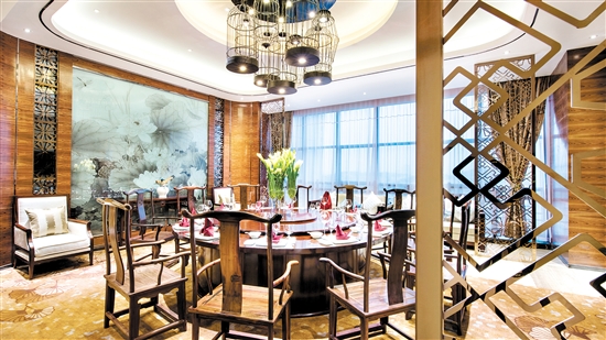 笔者了解到,酒店的三、四、五楼都有餐饮区。五楼为7米高超大无柱型的国际宴会厅,占地面积1000平方米,宴会厅可筵开63席。茶皇厅也位于酒店五楼,可筵开11席。另外,可容纳30人同时享餐的贵宾1房也在此层。