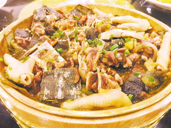 这道菜将一张荷叶铺在蒸笼上,然后放入红枣、枸杞等与切成小块的甲鱼、凤爪一起蒸,荷叶、红枣、枸杞的香味融合在甲鱼和凤爪里,每一块都很入味,是一道清淡、滋补的菜式。