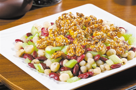 这道菜非常讨女性团友的喜爱。选用的小马蹄口感甜脆,红腰豆口感绵绵的,大厨在菜上面还铺了一层自己做的油炸核桃仁,香酥微甜。几种口感不同的美食搭配在一起,不仅营养丰富,还给食客带来特别的体验,仿佛就像饭桌上的零食,一粒一粒,一颗一颗,吃得停不下来。