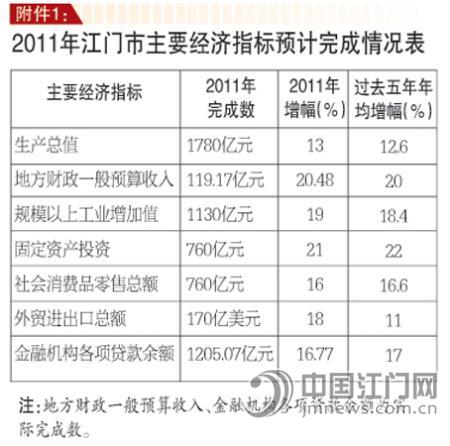 本届政府任期从2007年到2011年,五年来,市政府在省委、省政府和市委的正确领导下,在市人大及其常委会和市政协的监督支持下,深入贯彻落实科学发展观,加快转变经济发展方式,扎实推进经济社会建设和民生各项事业发展,全市经济综合实力跃上新台阶,2011年预计生产总值1780亿元,地方财政一般预算收入、规模以上工业增加值、固定资产投资、社会消费品零售总额、金融机构各项贷款余额等主要经济指标实现五年翻一番,较好完成了市第十三届人民代表大会、“十一五”规划和2011年确定的各项预期目标任务(见附件1)。特别是经过历届党委、政府和全市人民的共同努力,成功创建“全国文明城市”,标志着江门城市发展水平实现新跨越。