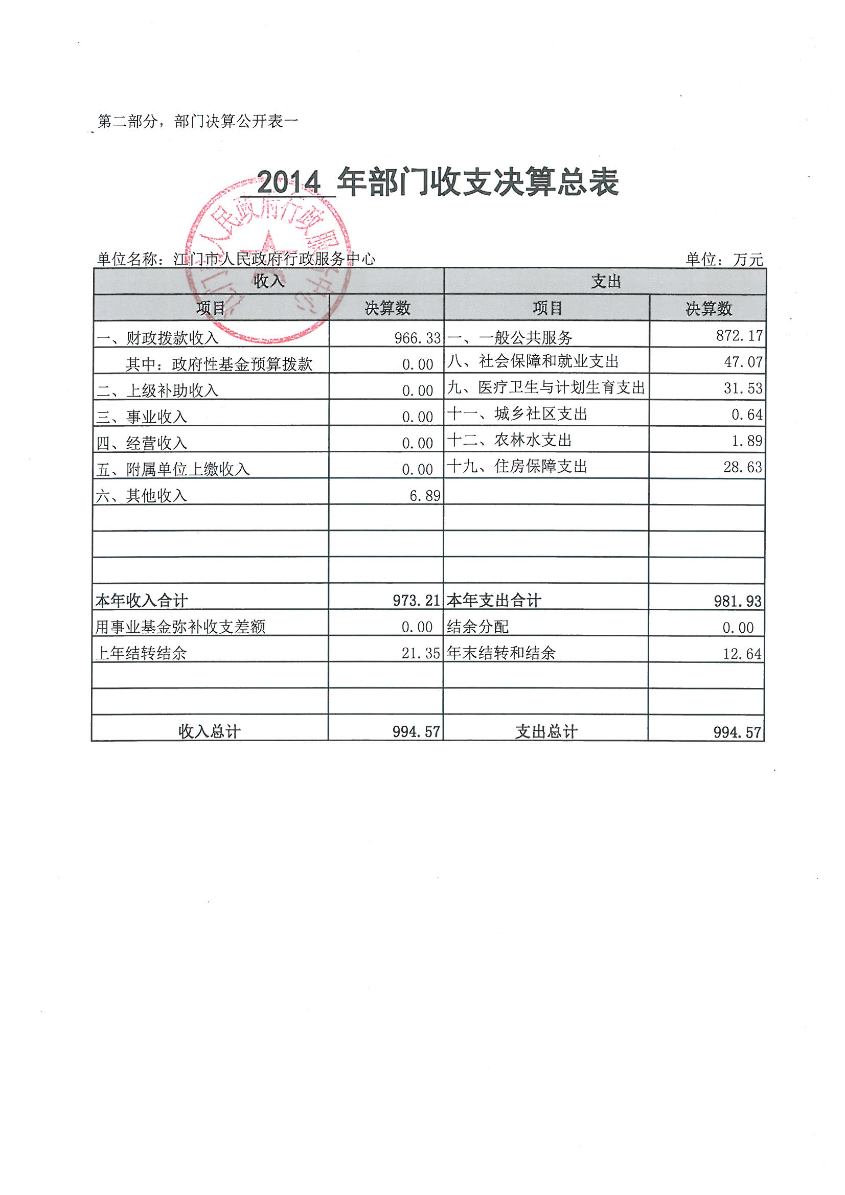 2014年部门收入决算994.57万元。其中:财政拨款收入966.33万元,占97.16%;其他收入6.89万元,占0.69%。上年结转结余21.35万,占2.15%。