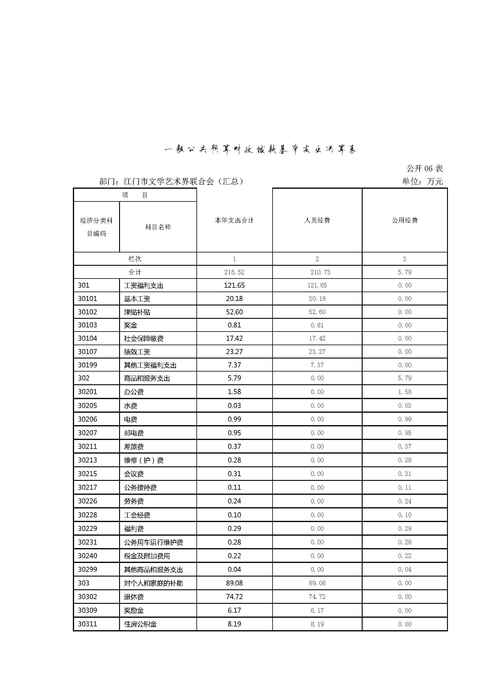 1.文化体育与传媒支出 619.04 万元,其中主要用于项目支出454.77万元:(1)江门书法院申报中国书法城专项经费5.00 万元;(2)江门书法院艺术作品展览、书法对外交流及“中国书法进万家”活动经费10.00万元;(3)江门书法院专项业务费15.00 万元;(4)江门书法院购买书画收藏室设备经费6.00 万元;(5)江门书法院筹办中国书协展览中心江门工作站(上年结转)30.00万元;(6)江门书法院普法宣传书法活动经费6.00 万元;(7)文联文艺服务下基层经费38.32万元;(8)文联第四届世青会会歌制作经费4万元;(9)文联原创文艺精品推广计划活动经费7.5万元;(10)文联文艺精品创作扶持经费69万元;(11)文联党员志愿服务经费0.1万元;(12)文联华侨历史组歌《闯金山》创作扶持经费20万元;(13)文联艺术培训数字化工程费用20万元;(14)文联SG飞艇(中国)开奖记录查询站 各文艺家协会日常工作协调经费116.66万元;(15)文联文艺精品展示交流经费49.7万元;(16)文联文艺家采风经费5万元;(17)文联新年音乐会经费5.3万元;(18)文联SG飞艇(中国)开奖记录查询站重点文艺作品扶持专项经费15万元;(19)文联美术、书法、摄影展览经费9万元;(20)文联书法家春节期间下乡送春联活动2万元;(21)文联专项业务费9.19万元;(22)文联文艺服务下基层经费12万元。基本支出164.27万元,主要用于人员和日常办公经费的支出,其中文联86.61万元,江门书法院77.66万元。