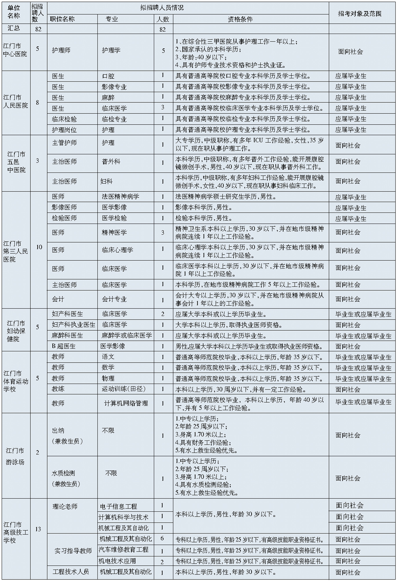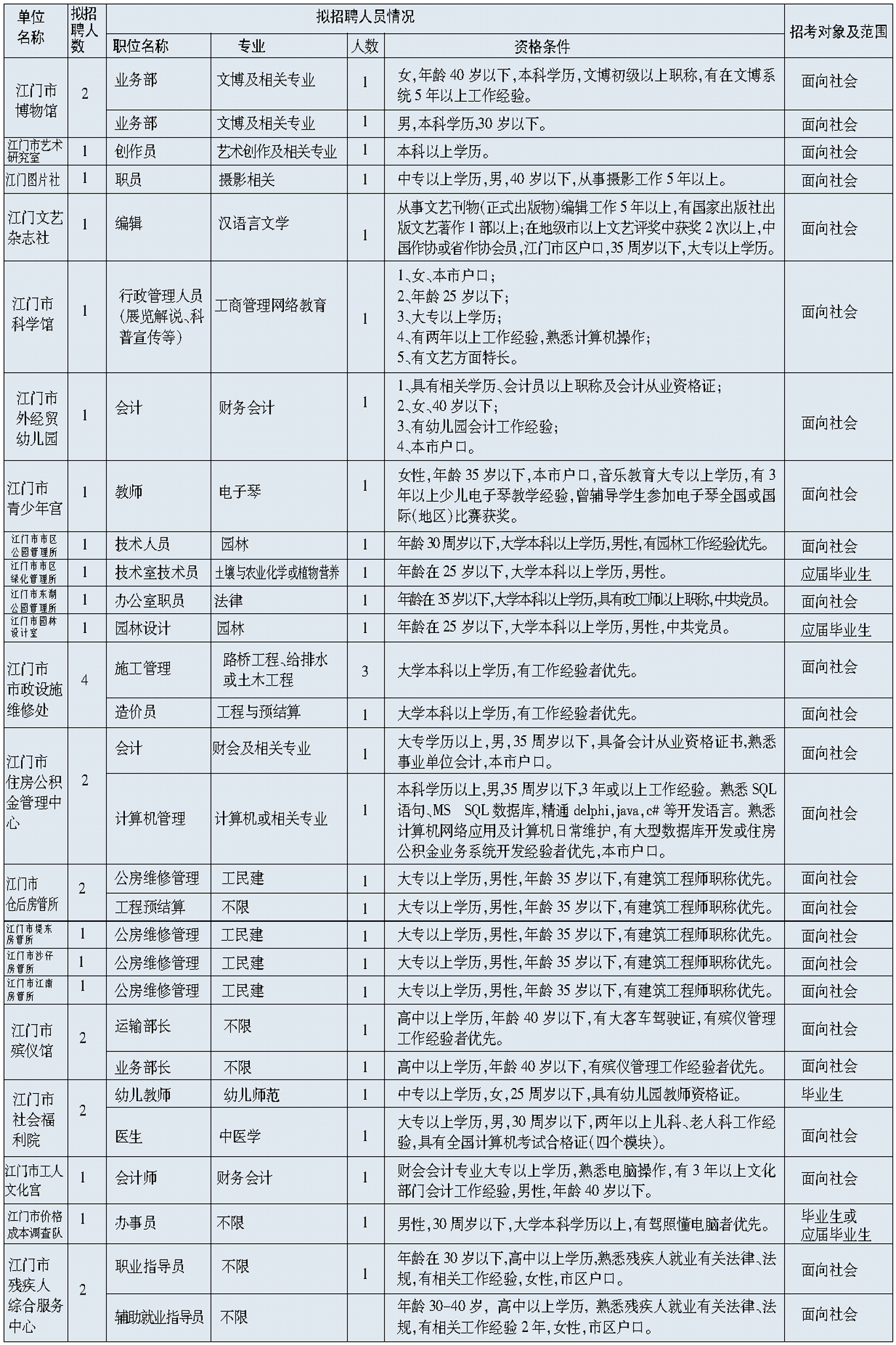 招聘实行竞争性选拔考试,考试内容、考试总成绩构成见江门人才网(WWW.JOBJM.COM)。