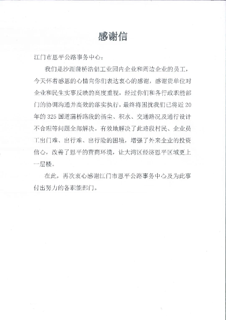 “多亏有你们的大力帮忙,困扰我们将近20年的国道G325线蒲桥路段的扬尘积水、交通路况及通行设计不合理等问题都得到有效的解决,给我们企业发展和安全出行提供了更大的保障。”近日,恩平市沙湖镇浩倡工业园企业代表许先生向恩平公路事务中心送来感谢信,并感激地说着。