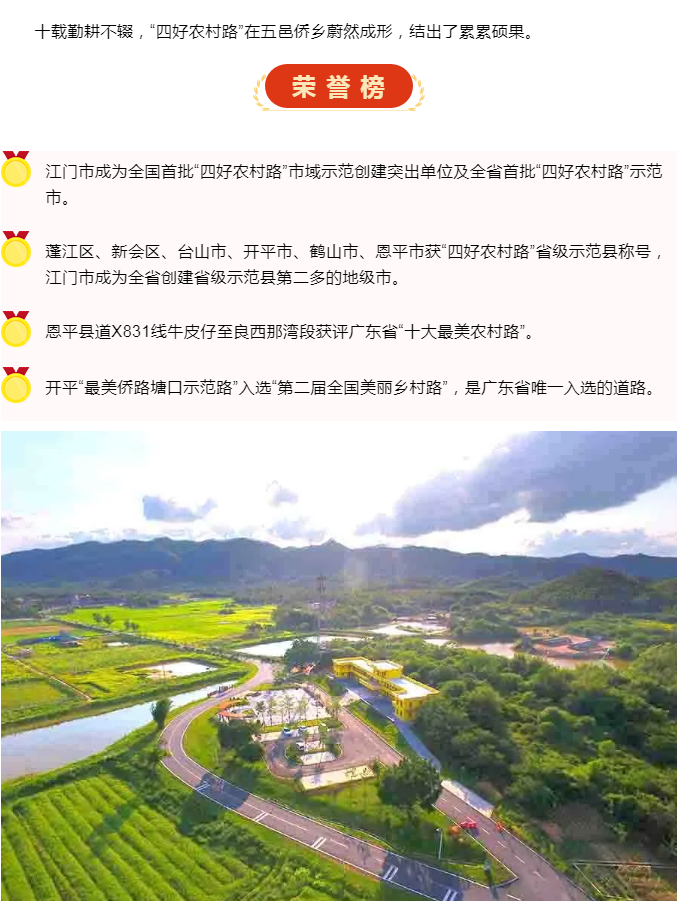 乡村经济以路为媒,因路而兴。农村公路网络的日益完善,打通了乡村振兴“出”与“进”双向道的“最后一公里”,为乡村产业发展注入源源不断的强劲动能。四通八达的农村公路,畅通了杜阮凉瓜、新会陈皮、台山富硒米、大沙茶叶、恩平四薯等江门特色农产品销售的流通渠道,为产业扶贫注入活力;带动了蓬江区良溪村文化古村落、江海区荷香生态园、台山市东南亚风情村、鹤山市古劳水乡等热门景点,加速了全域旅游发展,拓宽农民就业创业和发家奔小康的门路,让农村百姓的实惠不断“加码”。