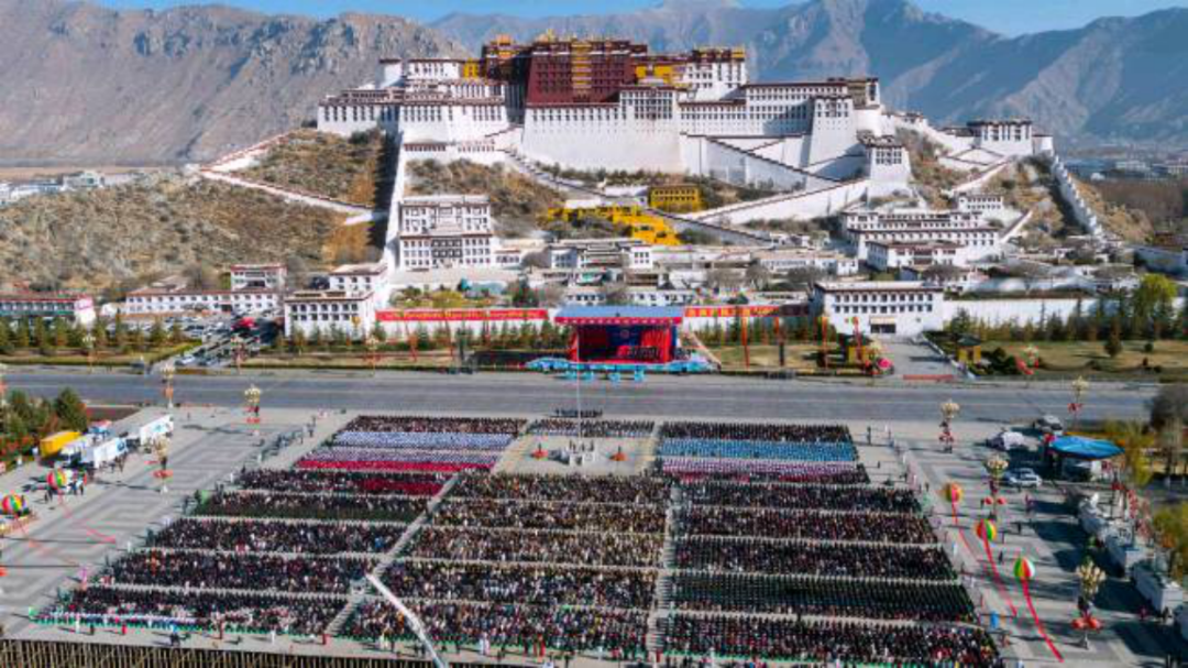 2019年3月28日,庆祝西藏民主改革60周年大会在拉萨布达拉宫广场举行(无人机拍摄)。新华社记者 普布扎西/摄
