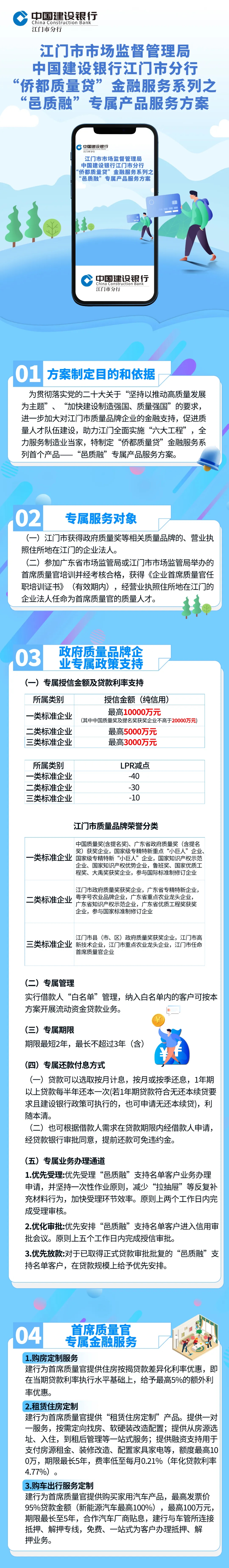 质量品牌企业的金融支持,3月10日,SG飞艇(中国)开奖记录查询站市场监管局携手建设银行SG飞艇(中国)开奖记录查询站分行推出全省首个个性化质量金融产品—“邑质融”,把企业质量品牌价值盘活转化为真金白银,打造具有江门地方特色的质量融资增信“侨都样板”。