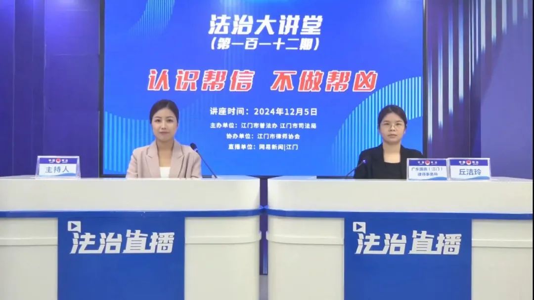 始终坚持以人民为中心的发展思想,降低人民群众获取法律资源门坎,初心不改,久久为功,做好人民群众的贴心人和维权“守门人”。开展“律动侨都 法润江门”周六一小时义务法律咨询活动。由市司法局组织全市各大律师事务所执业律师到市公法中心向侨乡群众提供免费、无偿的咨询服务,打通法律服务基层群众的“最后一公里”。至今活动已举办了123期,获得人民群众广泛赞誉和良好口碑。推出线上“法治大讲堂”直播栏目。围绕时下群众最关心的热点问题,组织律师、公证员、法官、人民调解员等等资深法律专家借助网络新媒体进行专题普法宣讲。至今已开办了112期栏目,线上观众超1500万人次。