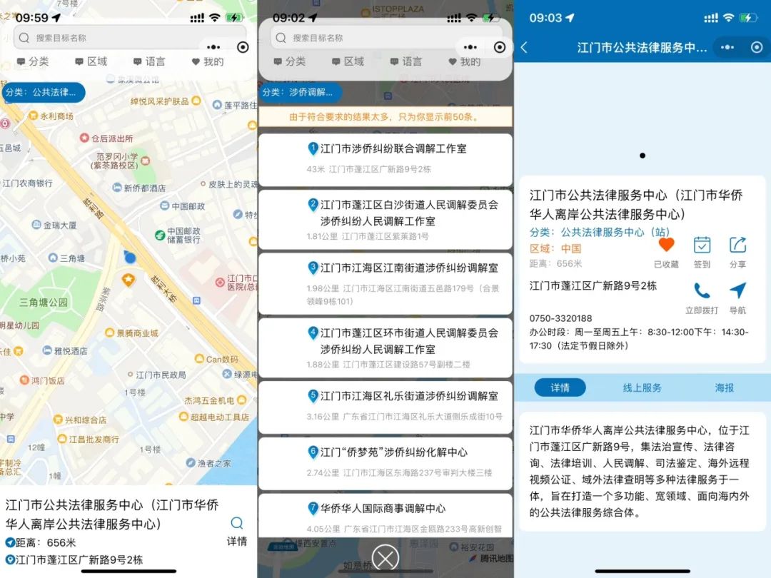 市司法局成功实现了“江门智慧司法”微信小程序与邑侨通涉侨法律服务平台、深国仲江门中心线上平台对接,新增法治地图和涉外法律服务地图双入口。新增江门涉外法律服务地图“涉侨调解组织”类别,导入全市71个涉侨调解组织,提供国内18个类别4452个本地法律服务机构和10个类别国外171个法律服务点的导航指引。2024年以来,全市共开展矛盾纠纷排查23925次,调处矛盾纠纷13701件,涉及金额7.02亿元。目前,现有人民调解委员会1562个,人民调解员9551人。涉侨调解室71个,调解案件391宗,涉及金额8360.96万元。