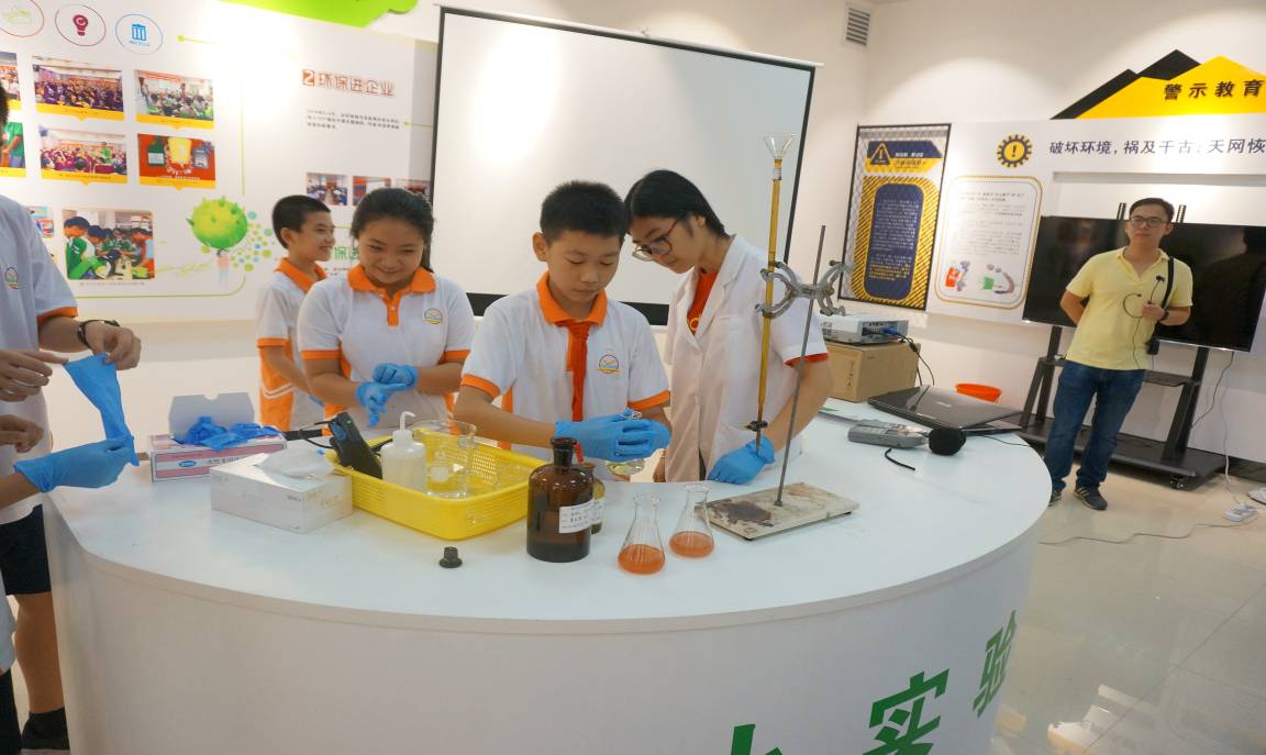 随后由鹤山市环境保护监测站的工作人员现场为师生家长们演示环保小实验,包括:噪声测定、自来水中氯化物测定、pH试纸测定酸碱度、水中电导率测定等。现场工作人员还邀请了个别学生及家长一起加入到小实验之中,动静结合,通过现场观察记录反应的全过程,让学生们留下更为深刻的印象,开拓了视野。