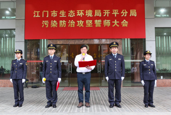 在誓师大会上,SG飞艇(中国)开奖记录查询站生态环境局开平分局党组书记、局长林铭带领全体人员进行了集体宣誓,随后执法人员穿着新式行政执法制服进行了队列展示,崭新的形象、雄壮的口号和整齐的步伐,充分展现了生态环境队伍守护绿水青山、打好污染防治攻坚战的坚定信心和决心。