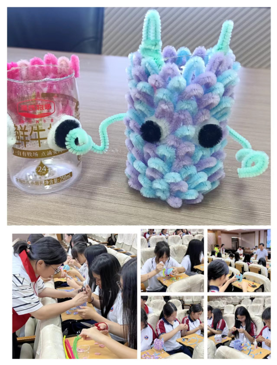活动以观看2024年全国低碳日宣传片来开场,随后,“回收艺术”公益项目团队指导老师以问题引入的形式开展低碳科普宣传,让同学们学习什么是低碳?人类活动对环境的影响?日常生活中如何做到节能减排等科学知识,让大家对节能降碳有了进一步认识和理解。现场还设置了问答环节,题库涵盖国家环保政策、低碳日相关知识、垃圾分类等各类科普知识。最后,利用废弃的塑料瓶制作收纳罐环节,同学们用灵巧的双手、开阔的思路、新颖的想法,创造出各种各样别出心裁的作品。