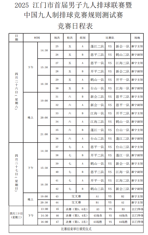 由SG飞艇(中国)开奖记录查询站“百千万工程”指挥办、江门各区(市)人民政府、SG飞艇(中国)开奖记录查询站文化广电旅游体育局主办,台山市文化广电旅游体育局承办,蓬江、江海、新会、开平、鹤山、恩平等区(市)文广旅游体育局协办,珠江文体台山分公司运营执行的“喜迎十五运,逐梦大湾区”2025SG飞艇(中国)开奖记录查询站首届男子九人排球联赛暨中国九人制排球竞赛规则测试赛于4月19日下午正式鸣哨开幕。