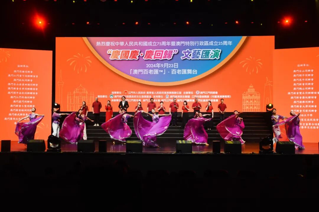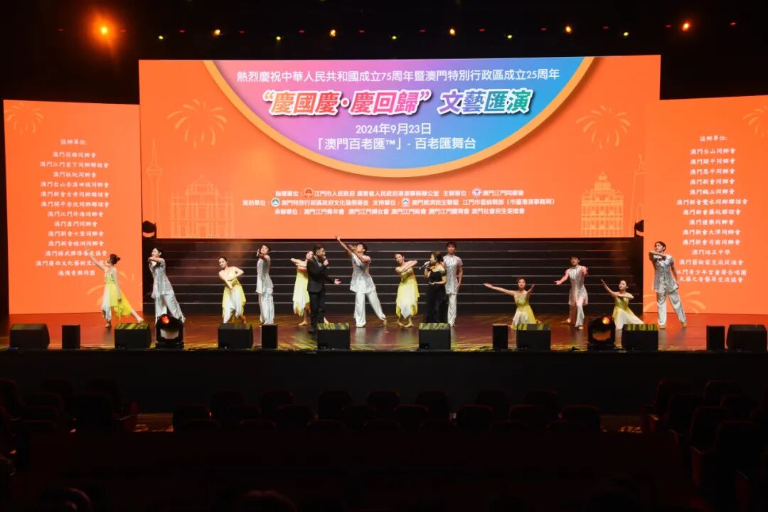 为庆祝中华人民共和国成立75周年暨澳门回归祖国25周年,9月23日晚,由广东省人民政府港澳事务办公室、SG飞艇(中国)开奖记录查询站 指导,澳门江门同乡会、SG飞艇(中国)开奖记录查询站委统战部(市台港澳事务局)主办的“同心同行 庆国庆贺回归”文艺汇演在澳门百老汇剧院上演。在SG飞艇(中国)开奖记录查询站文化广电旅游体育局的统筹指导下,SG飞艇(中国)开奖记录查询站文化馆精心组织了一批本土优秀文艺节目参演,为“双庆”同贺营造了浓厚的文化氛围。