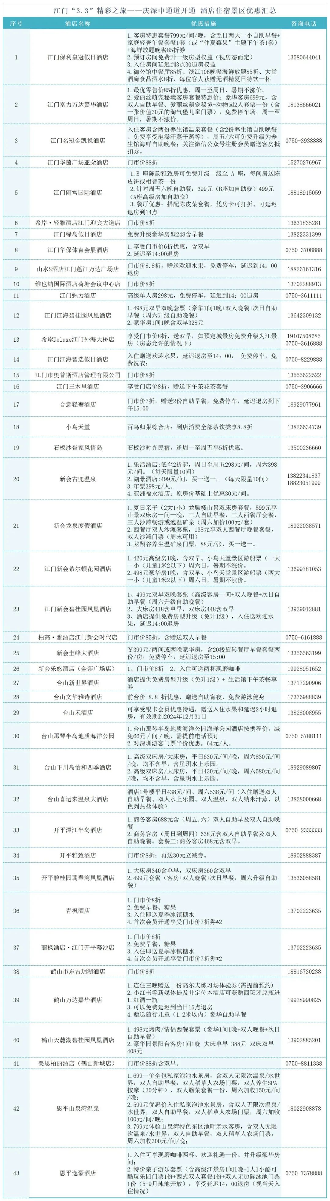 注:游客出示深圳身份证、居住证,或持深中通道ETC消费凭证、深江空港快线(深圳机场往江门方向 ),凭证均可享受以上优惠,活动有效期至2024年8月31日。请与各酒店、景区提前沟通咨询,优惠内容最终以各酒店、景区解释为准。