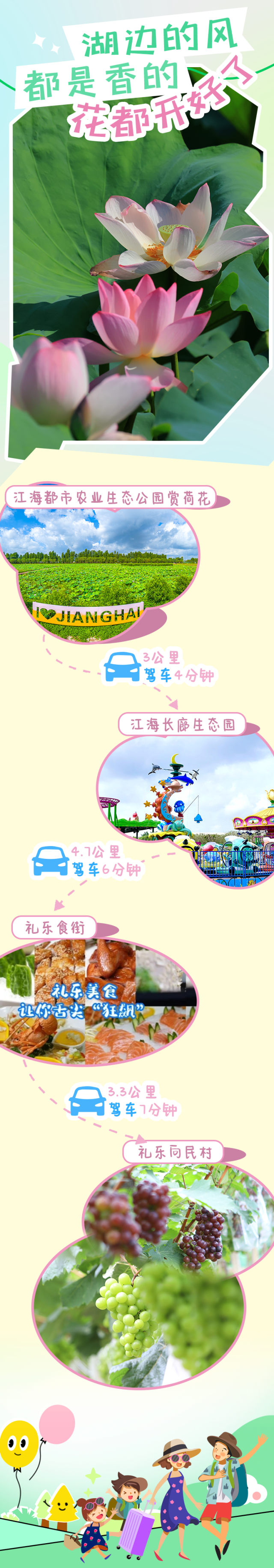 游玩路线:江海都市农业生态公园赏荷花——江海长廊生态园体验亲子乐趣、感受童真童趣——礼东美食街品尝地道美食——礼乐向民村采摘瓜果