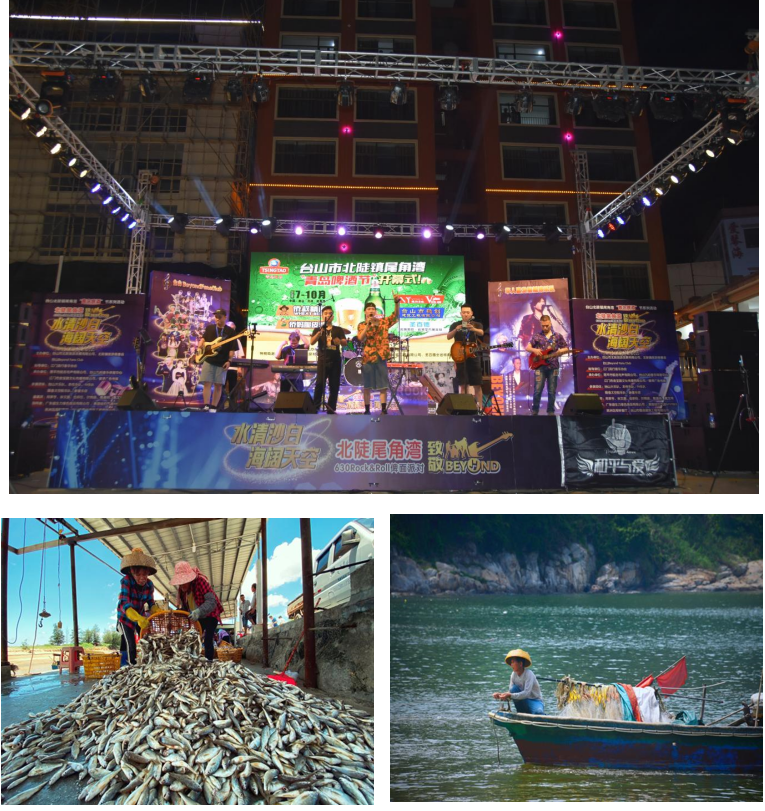 北陡镇浪琴湾有尾角、沙咀等十多条渔村,村民世代以捕鱼为业,以海为生。夕阳西下,出海的渔船悠悠而归,渔人挑着渔网、海鲜,踏着金色的海水上岸。海滩上,游人在嬉戏玩耍,别有一番情趣。