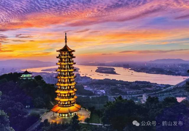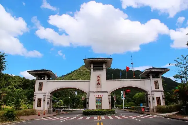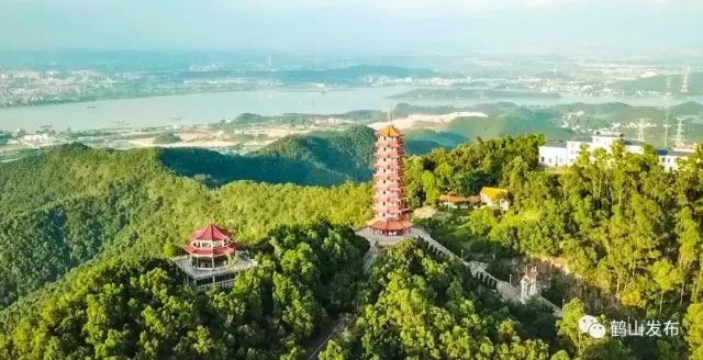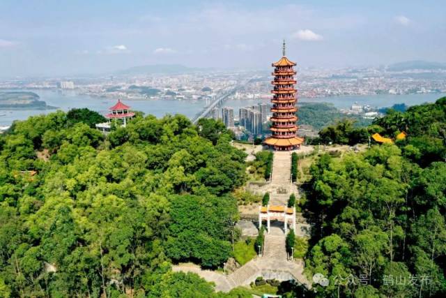 行至雁峰山顶处,可见“纪元塔”拔地而起,八角式攒尖顶宝塔,丹柱黄瓦、斗拱飞檐,气派非凡。俯览山下,处处花木繁茂,珠三角西岸千里风光尽在眼前。此时,阵阵清风徐来,满是惬意。