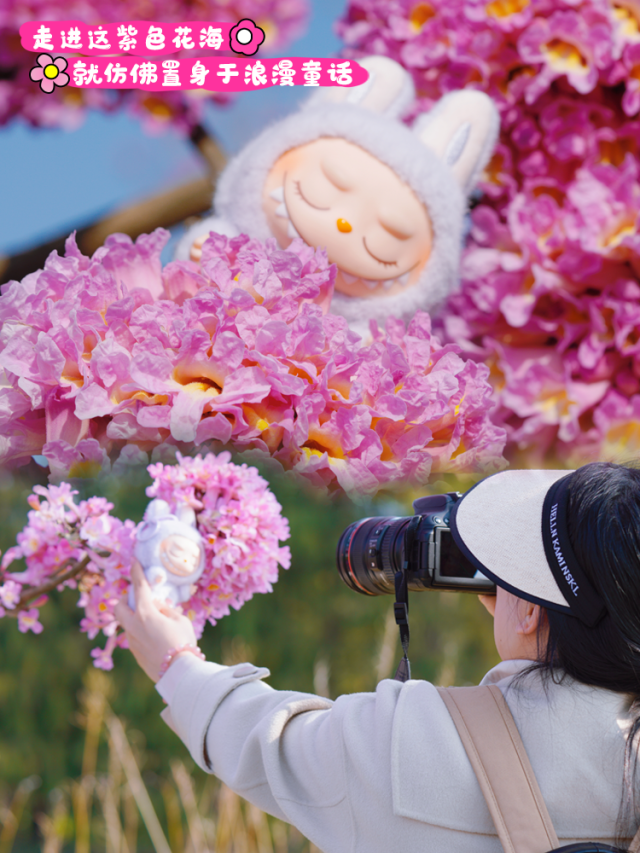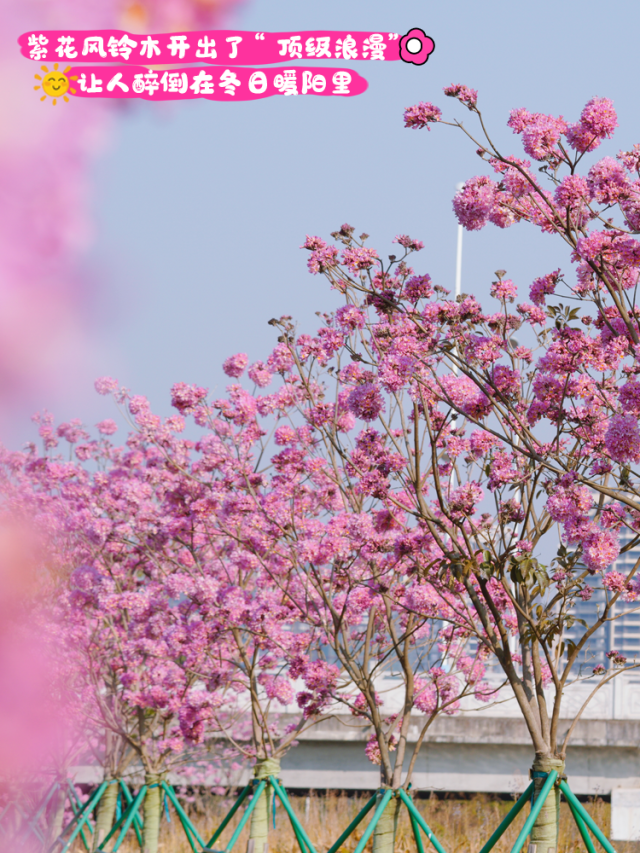 今天我请客请大家赏浪漫紫色花海生活在江门这座城市,一年四季都有惊喜——这不,江门又有新的花海开放啦!那就是——紫花风铃木。近日,江门站前的紫花风铃木盛开,静静驻足观赏,沉浸于梦幻色彩中,心情瞬间被治愈。抬头一望,你就可以看见紫粉的花球挂在枝头,与蔚蓝的天空交相辉映,令人陶醉。再咔嚓按下快门,就可以拍出一张美美的照片了。花海免费参观,趁着阳光灿烂,快换上美美的服装,拍出大片啦。