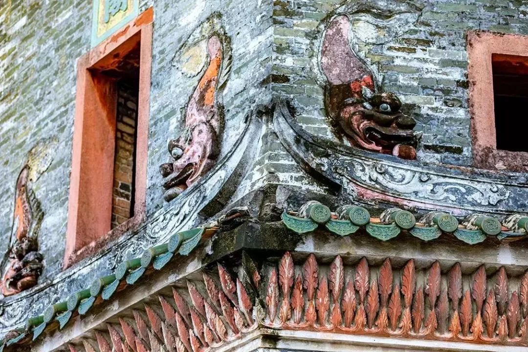 楼顶为平屋顶,南面设灰塑山花。该楼是会城城区少数仅存的碉楼之一,是新会典型的碉楼,保存较好。