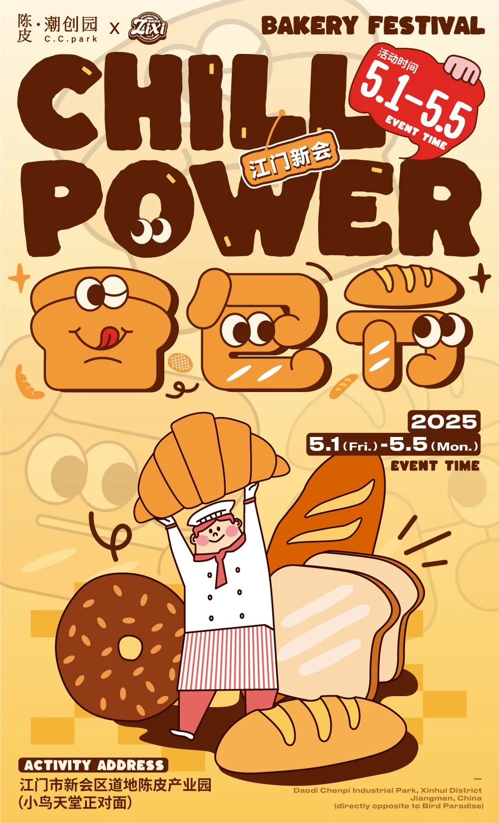 “面包脑袋”集合!2025年江门地区首个面包主题活动来啦!这个五一假期,一起相约道地陈皮潮创文化园,一起“发酵”快乐!该活动将集合100+全国烘焙品牌,齐聚新会道地陈皮潮创园,Chill烘焙派对—年轻就要“包”容万象。