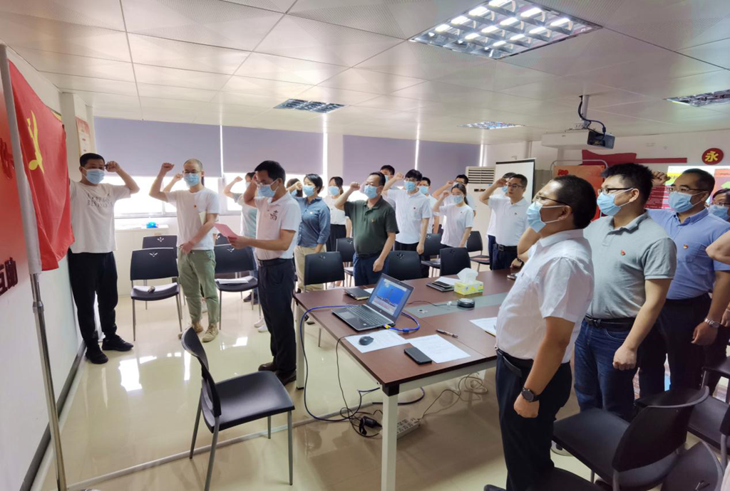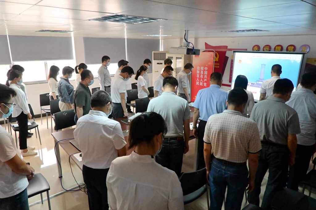 全体党员、团员在列队整齐高唱国歌后,怀着敬重的心情鞠躬默哀,藉此缅怀先烈。随后在中心党组成员、副主任戚荣沾的领誓下,全体党员重温入党誓词,坚定理想信念和信仰追求。紧接着,大家共同观看了中华英烈网《闪亮的坐标:他们永远年轻》视频,然后由中心党支部副书记徐成宇以追忆《数风流人物:茅以升 建造钱塘江大桥的中国桥魂》为主题,为大家上了一场饱含情感且形象生动的党课,带领大家深入学习思考如何扎实做好代建工作。