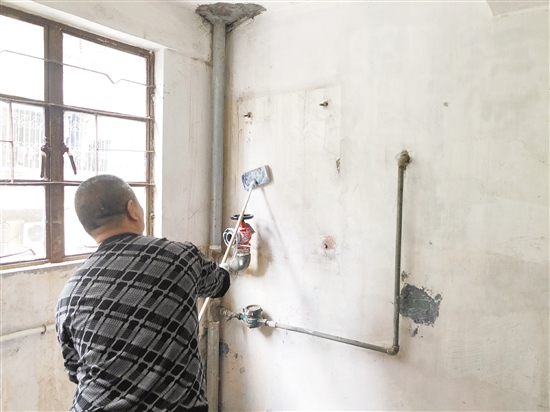 河南社区一座居民楼内,工人正在粉刷墙面。