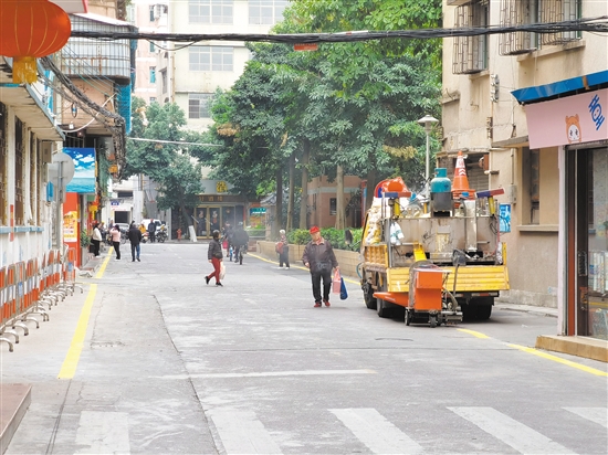 有关部门正在河南社区内加紧施划停车线、停车标识。