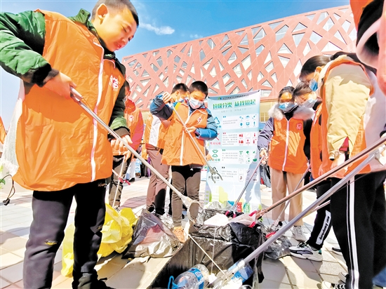 江门一中青少年志愿者协会义工服务队的同学们利用节假日参加志愿活动,在江门演艺中心、釜山公园一带清理沿路的垃圾。